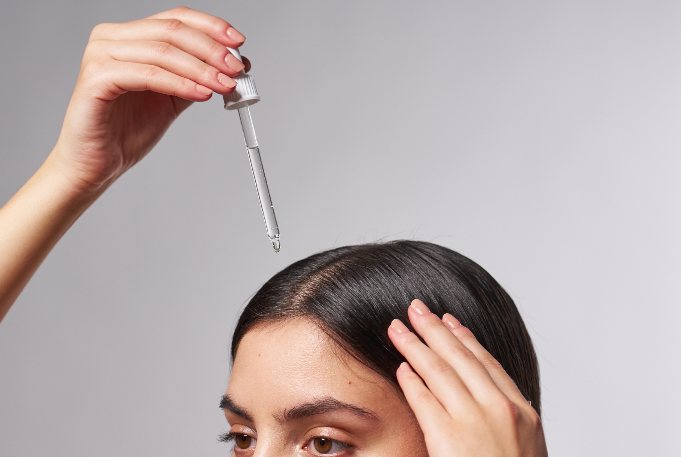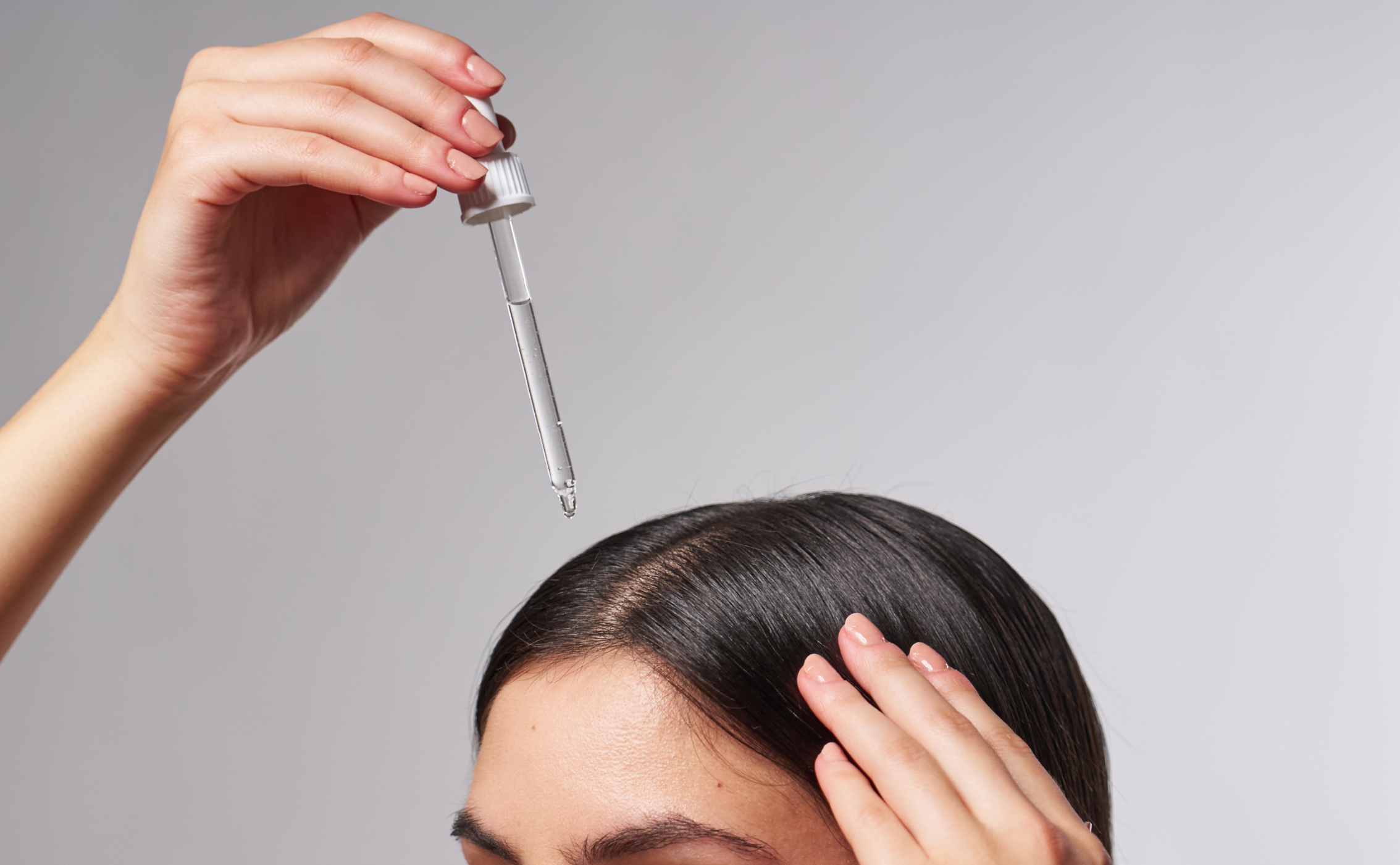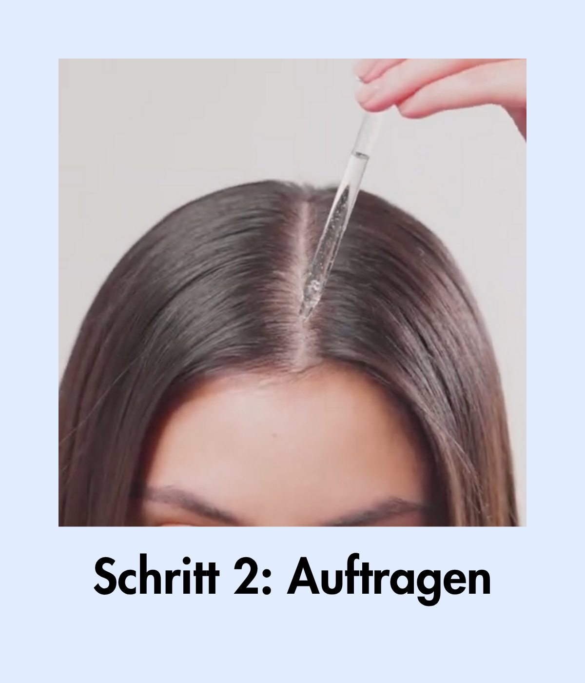 Fülle die Pipette mit Serum und beginne mit einer der vier abgeteilten Partien. Setze die Pipette direkt an die Kopfhaut und gib dort nach und nach kleine Mengen des Serums auf mehrere Punkte innerhalb dieses Bereichs. Verwende insgesamt etwa zwei volle Pipettenfüllungen. Wenn Du besonders dünne Stellen oder Bereiche mit sichtbar reduziertem Haarvolumen hast, trage dort gezielt etwas mehr auf. Wiederhole diesen Vorgang für alle vier Partien, bis die gesamte Kopfhaut gleichmäßig behandelt wurde.